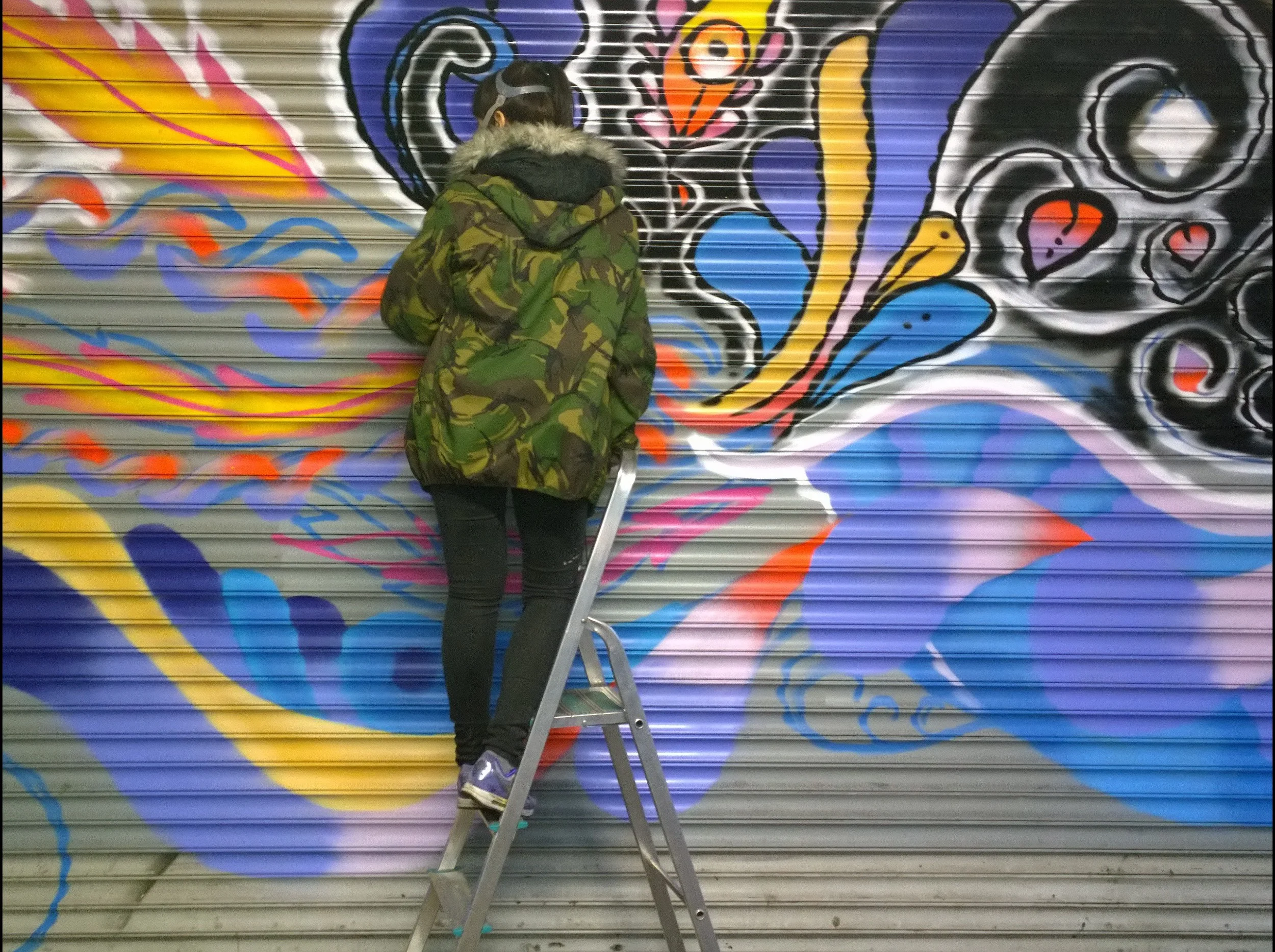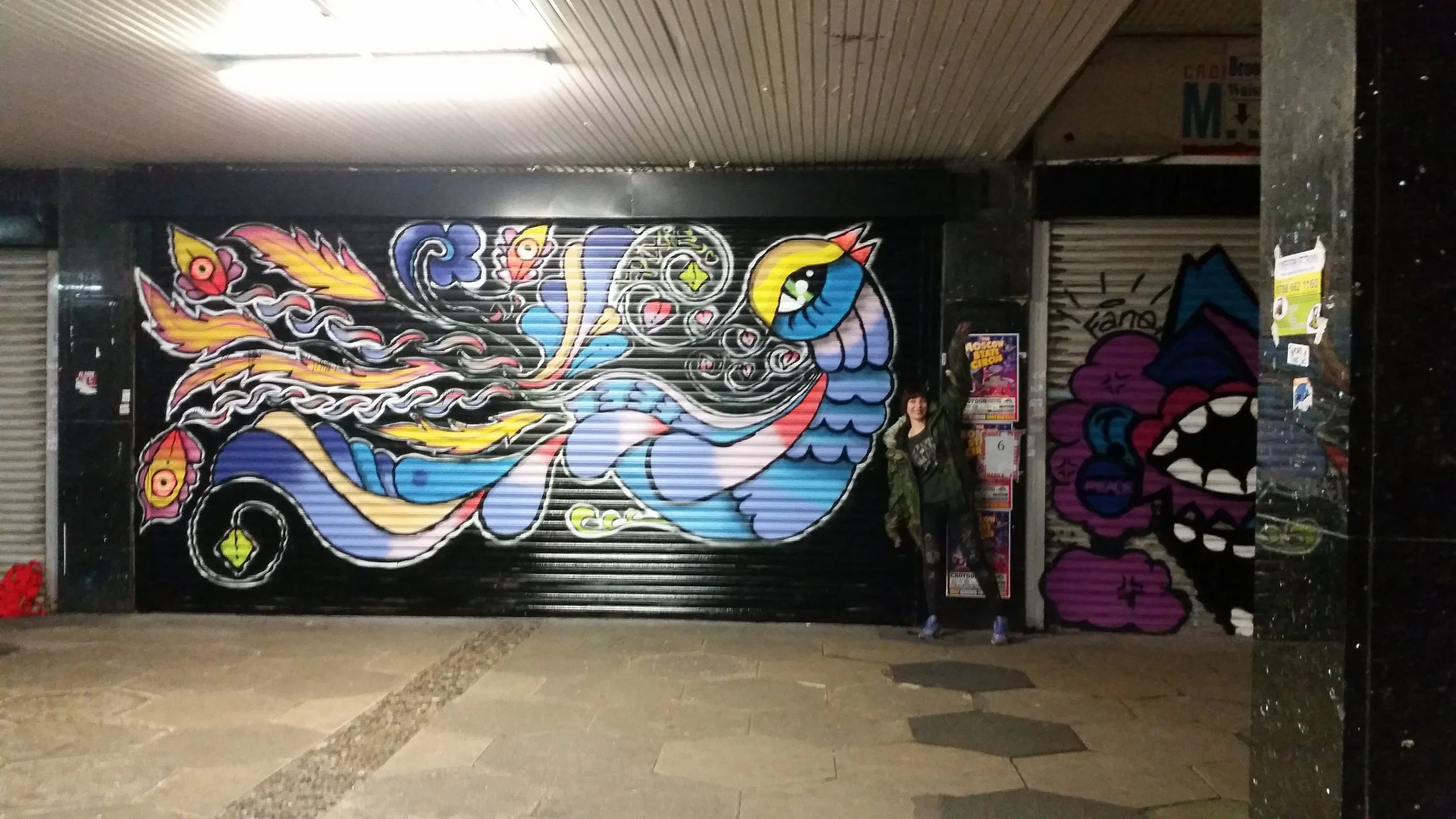 Myself and over 100 other female artists hit Croydon city centre to paint art all over shop shutters and walls, as a kickstarter for a large project called "Femme Fierce" . I painted alongside Neonita, representing our crew Girls On Top Crew, and we really enjoyed our day as we painted the entrance to the St.Georges Walk shopping centre.